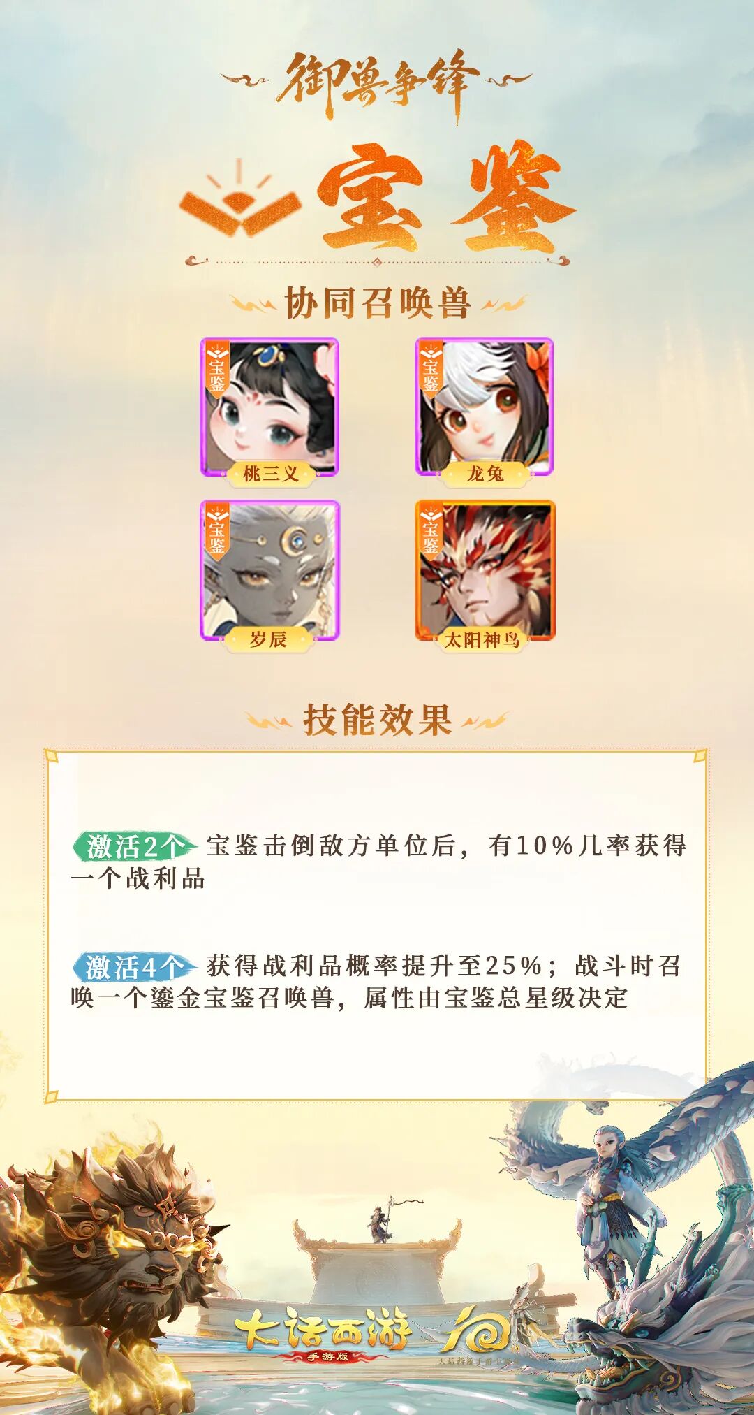 宝鉴羁绊,凑齐四个单位后,击倒敌方获得战利品的概率提升至25%,进一步强化资源获取效率;同时,对战过程会召唤出额外的鎏金宝鉴召唤兽参战,其属性由宝鉴总阶级决定,阶级越高召唤兽战力越强,相当于额外增加一个战斗单位,提升阵容的输出和承伤能力。