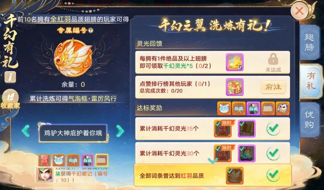2)专属编号:每个服务器前10位将千幻之翼四个词条曾洗炼至红羽品质的少侠,可领取象征身份、带有专属编号的千幻勋章!