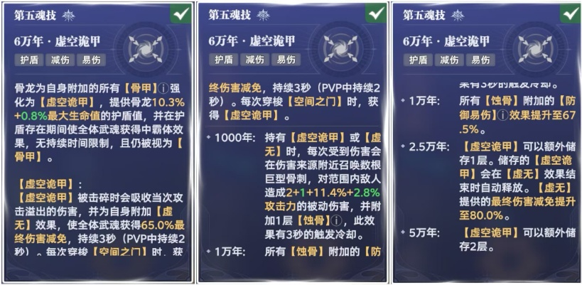 但是,当【虚空诡甲】被击碎时会吸收当次溢出的伤害,并且为自身附加【虚无】效果,使全体武魂获得65%的最终伤害减免。当持有【虚空诡甲】和【虚无】时,被攻击还会召唤骨刺反伤。更离谱的是,【虚空诡甲】可以额外存储1到2层,防御能力非常强悍,非常适合PVP。