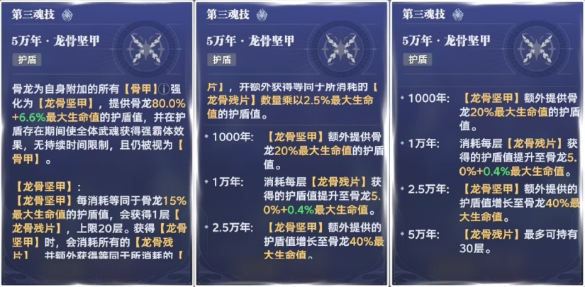 三环被动将【骨甲】强化为【龙骨坚甲】,提供骨龙一定比例最大生命值的护盾值。并且当【龙骨坚甲】每消耗等同于骨龙15%最大生命值的护盾值,会获得1层【龙骨残片】,上限20层。获得【龙骨坚甲】时,会消耗所有的【龙骨残片】,并额外获得等同于所消耗的【龙骨残片】数量乘以2.5%最大生命值的护盾值。
