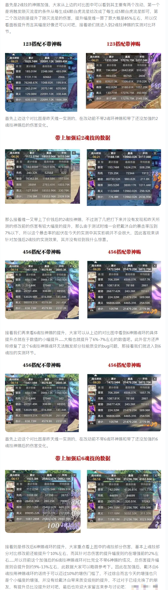 今天我们的关键还是针对加强后的戴沐白神赐魂环的实测报告,其中主要是加强了白虎2、6神赐魂环的输出伤害和修正了一个bug问题,而这两个提升到底在哪呢?接着我们来简单看下对比图: