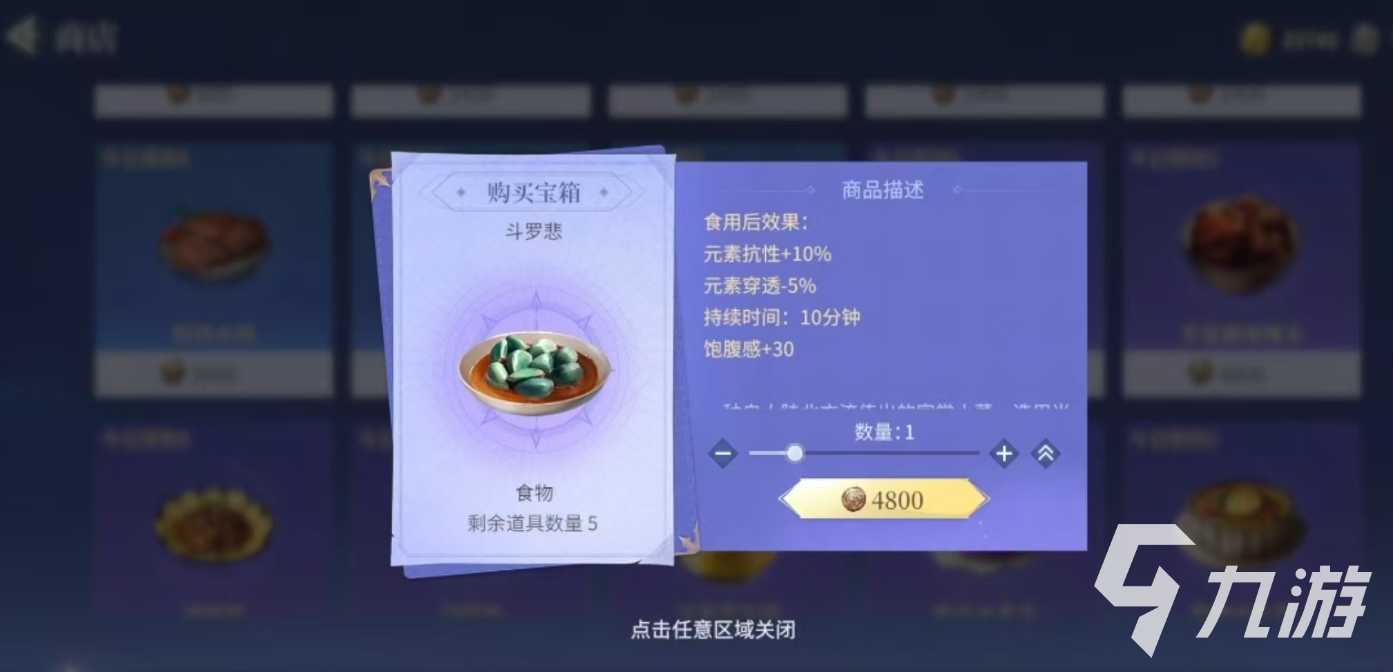 在烧锅旁边往往还会有相应的美食商人,打开商店之后,这里会出现各种食材以及不同的美食,但要注意商店出售的食材和美食都有限购的数量。玩家可以选择先通过商人购买食材的方式去烹饪,不够的部分在自己去世界中搜索。美食成功制作完成之后就会出现在背包中,然后根据战斗需要去选择就是。例如斗罗悲,使用之后可以增加10%的元素抗性,降低5%元素穿透,持续时间10分钟,还有30点饱腹感,这就适合元素抗性比较低的玩家选择增加生存能力,其他美食各有自己的属性,可以逐个去查看。