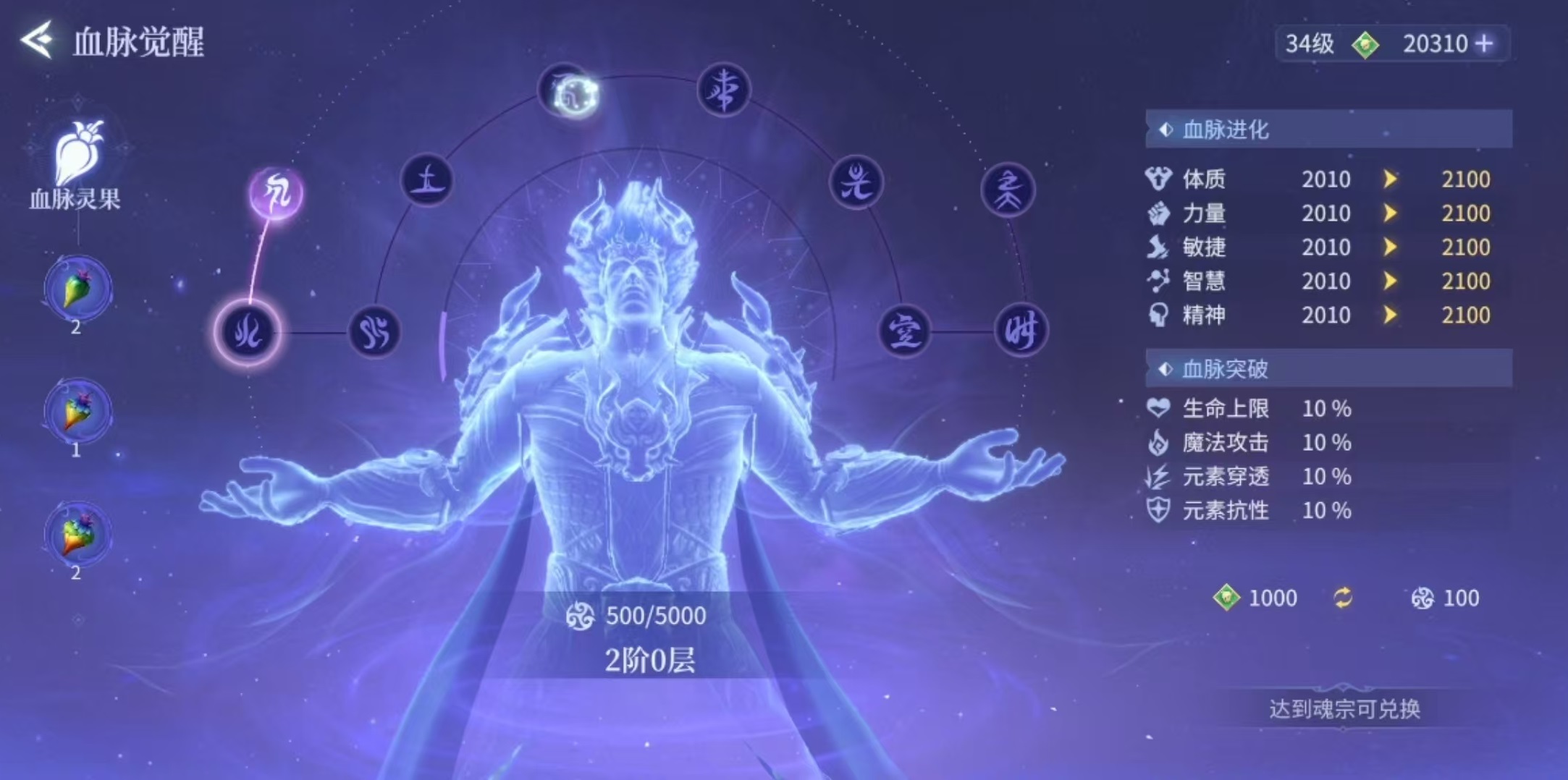 血脉的养成又分为进化和突破这两大类,每提升一层都可以提供血脉进化,效果主要增加的是5种关键属性,分别是体质、力量、敏捷、智慧和精神,在这里提升的数量都是非常均衡的。等到达到一定层数之后,就可以进行突破,突破提升的是百分比上限,每突破一次都是巨大的提升。例如玩家一开始是一阶0层,在一阶提升到10层之后就可以进行突破,突破之后就达到了二阶,从0层开始继续往上提升。