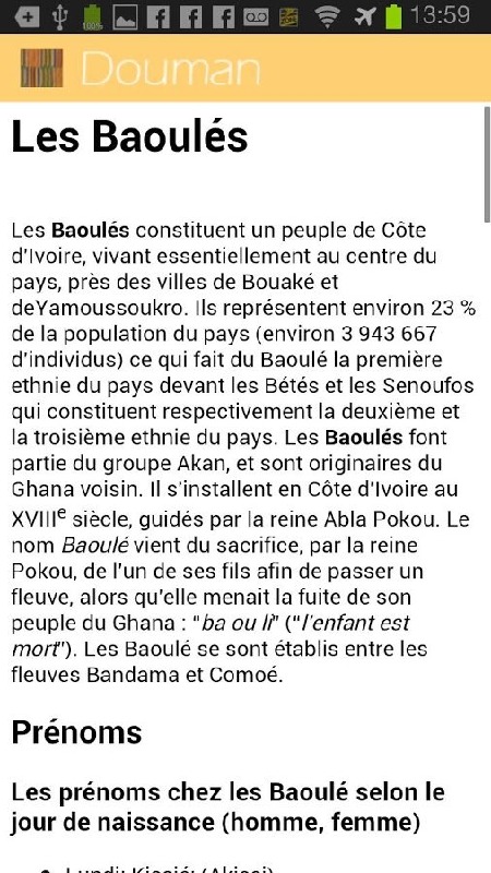Les Baoulés constituent un peuple de Côte d'Ivoire, vivant essentiellement au centre du pays, près des villes de Bouaké et de Yamoussoukro. Ils représentent environ 23 % de la population du pays (environ 3 943 667 d'individus) . Les Baoulés font partie du groupe Akan, et sont originaires du Ghana voisin. Il s'installent en Côte d'Ivoire au XVIIIe siècle, guidés par la reine Abla Pokou. Le nom Baoulé vient du sacrifice, par la reine Pokou, de l'un de ses fils afin de passer un fleuve, alors qu'elle menait la fuite de son peuple du Ghana : “ba ou li” (“l'enfant est mort”). Les Baoulé se sont établis entre les fleuves Bandama et Comoé.Envie de vous trouver un nouveau prénom? Fatigué des noms Japonais Indien? Trouver votre prénom venant tout droit du peuple Baoulé
