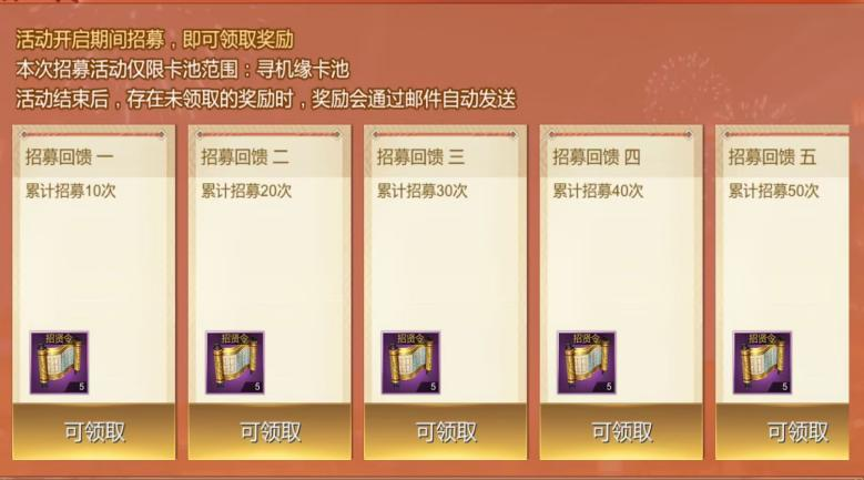 活动介绍:限时招募福利开启!参与即领好礼,更享招募券返还! 活动期间,只要在指定「限定卡池」内进行招募,即可即时领取对应奖励,每一次招募都有实在回馈,福利拿得更直观!无需担心遗漏奖励! 本次招募福利仅针对「限定卡池」,活动结束后若有未手动领取的奖励,系统将自动通过邮件精准发放,确保你不错过任何一份招募回馈,轻松参与、福利稳拿!