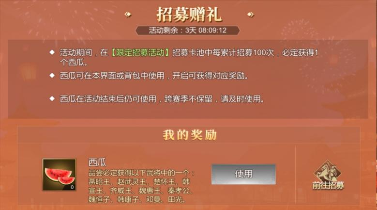 活动介绍:招募达标必拿好礼,限定武将稳解锁! 活动期间,在【限定招募活动】卡池内每累计招募 100 次,即可100% 必得 1 个「西瓜」 !打开「西瓜」可随机获得 1 名「剧本 - 王」系列限定武将 —— 全系列武将均为专属限定款,任意一款都是稀缺「王」级战力,错过难再得!