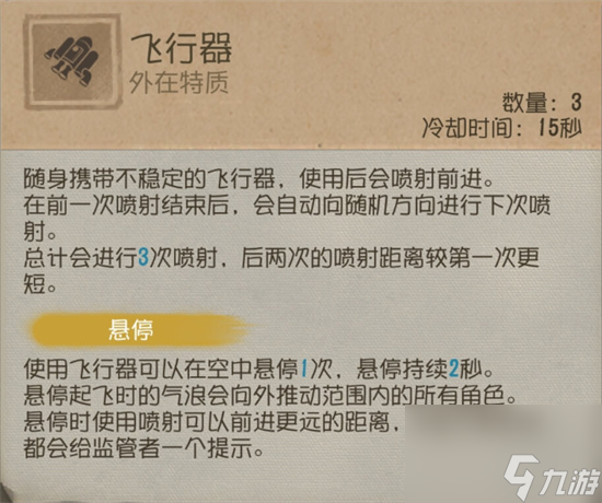 飞行家携带强大的飞行器,可以使用三次,每次使用后有15秒的冷却时间。飞行器可以快速推进玩家,每次使用后会自动朝着随机方向发射下一次推进。需要注意的是,每次使用飞行器时,最后两次的推进距离会比第一次短。这个技能让玩家在紧急情况下能够快速移动,逃离监管者的追捕,或者迅速到达密码解锁机器的位置。