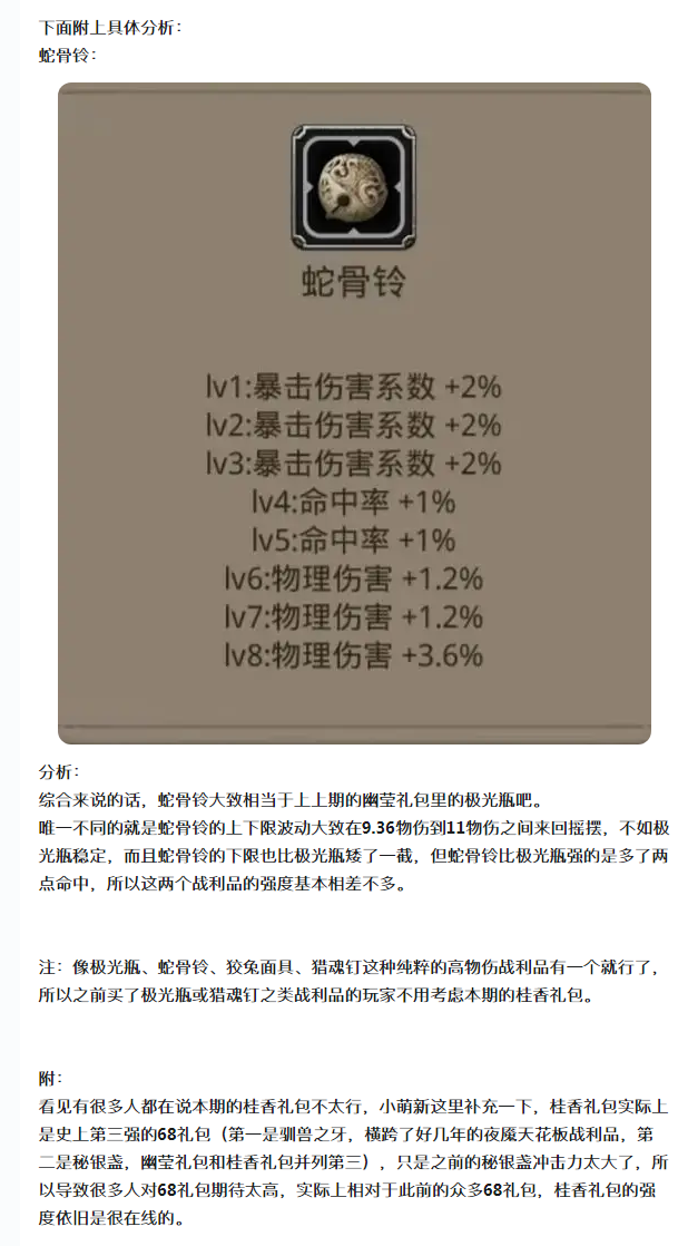 看见有很多人都在说本期的桂香礼包不太行,这里补充一下,桂香礼包实际上是史上第三强的68礼包(第一是驯兽之牙,横跨了好几年的夜天花板战利品,第二是秘银盏,幽莹礼包和桂香礼包并列第三),只是之前的秘银盏冲击力太大了,所以导致很多人对68礼包期待太高,实际上相对于此前的众多68礼包,桂香礼包的强度依旧是很在线的。