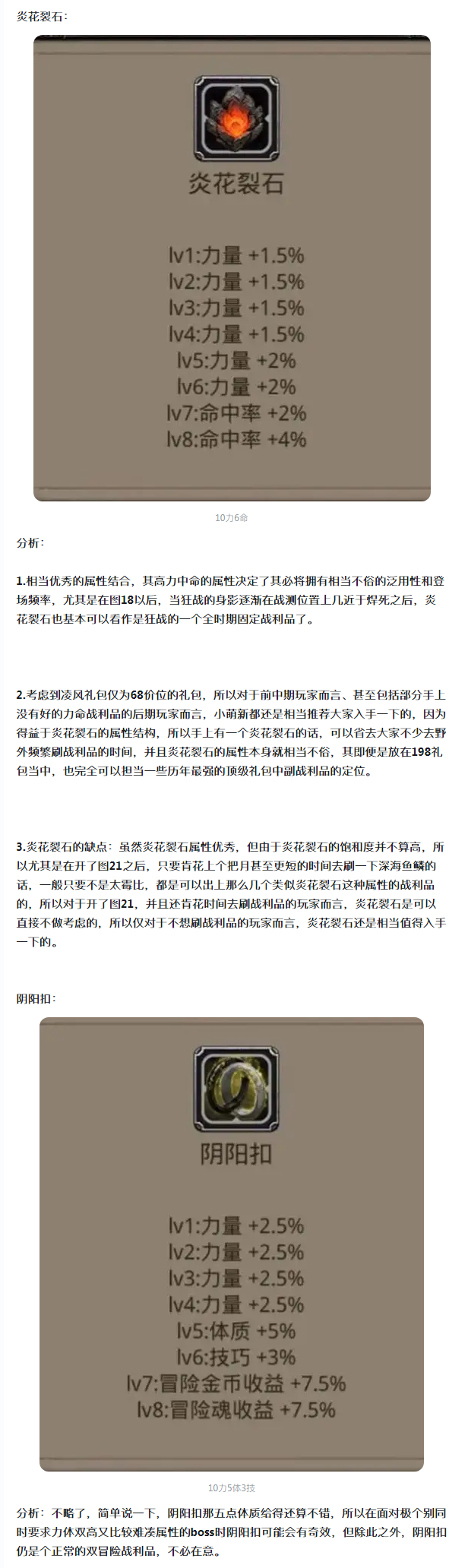 开篇总结:实际上,炎花裂石10力6命的属性其实在泛用性和登场频率上都是相当不错的,所以总的来说,凌风礼包的强度应该仅在此前的驯兽之牙、秘银盏、极光瓶、翻版极光瓶等四个最强的68礼包之下。而除了上述四个超标怪之外,在历年的68礼包当中,凌风礼包的属性完全可以算得上是极强的那一档了。