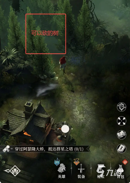 在找到这片树林后,就需要仔细对这些树木进行观察了,主要是看看树旁边的特效,只要找到目标,接下来不管是砍树,还是采集都是比较简单的。当然也需要注意下,松鼠炼金术士的小屋上面可能有毒物,需要先对其驱散。