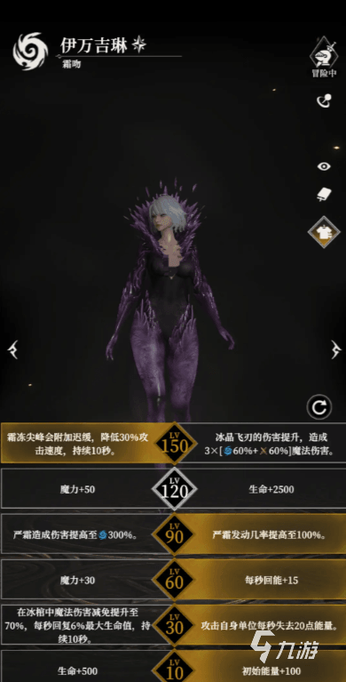 她在初始天赋可选加500生命,或加100初始能量,5级天赋可以让自己在冰棺之中的魔法伤害减免也提升到70%,每秒回复6%最大生命值持续10秒,或让攻击自身的单位每秒失去20点能量,60天赋可选每秒回能加150或魔力加30,90级可选让严霜造成的伤害提升300%,或发动几率变成100%。