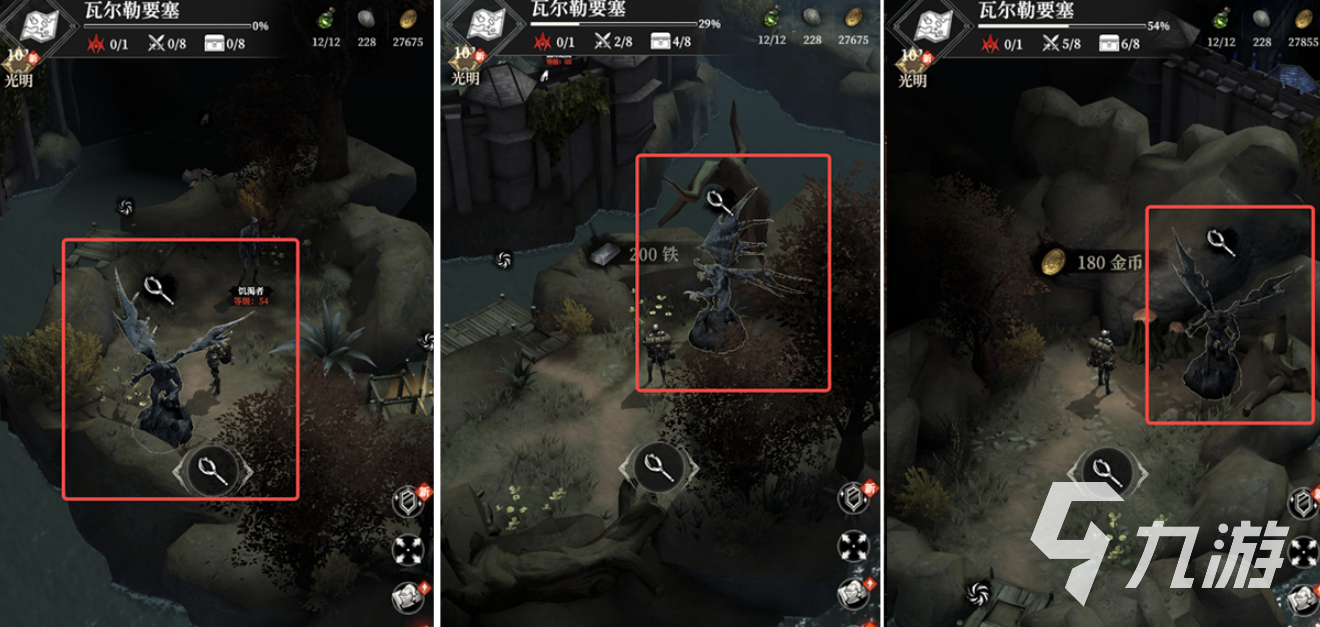 地图资源方面,在上岸后需要摧毁两座塔楼,奖励物资。继续探索时,如果前往城区右下方并击败兜帽修士,还能获得藏品“深渊之镜”。左侧的城堡区域则有多段挑战,首先需要选择击退杂兵或投掷粗制火药炸开大门,成功进入后即可营救工匠,直接工匠+2。