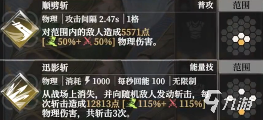 赛拉菲妮的普攻“顺劈斩”射程一格且无能量消耗,能够对范围内的所有敌人造成物理伤害,伤害由“敏捷”和“攻击力”加成,各占50%。这样一来,她的普攻不仅依赖攻击力,也很看重敏捷属性的堆积,如果你的赛拉菲妮敏捷属性高,那么普攻输出也能很可观。