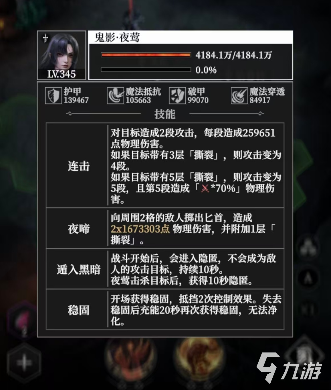 夜莺是游戏中第16章的boss,属于比较常规的类型,打法相对简单。它具有的连击可以对目标造成两段攻击伤害,如果目标身上带有撕裂,则攻击变为多段,撕裂的层数越高,打出的伤害就越高。还有技能遁入黑暗,战斗开始后会直接进入隐匿状态,不会成为敌人的攻击目标。在夜莺击杀目标后会获得持续隐匿,开场就能获得稳固抵挡控制效果。搞清楚技能之后,阵容搭配其实比较简单。