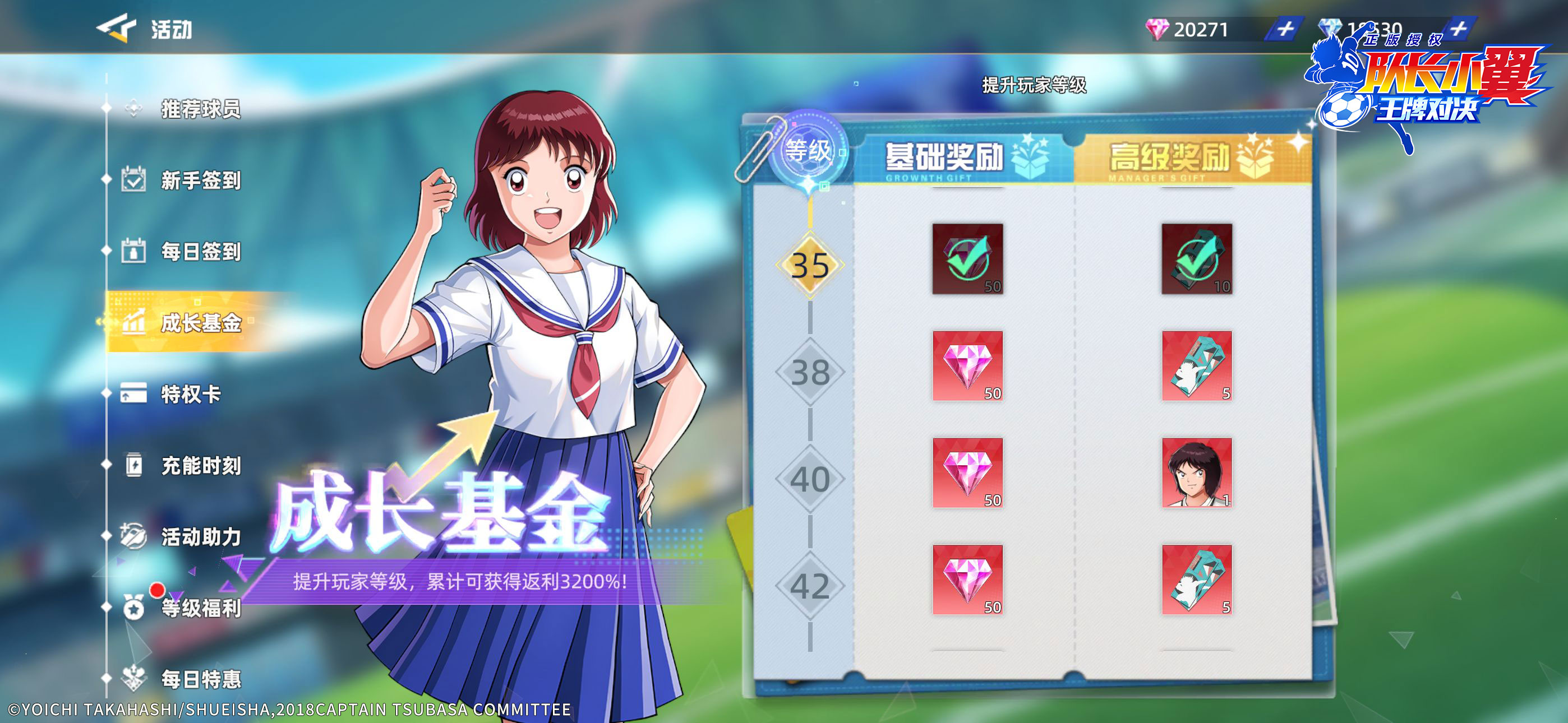 达到指定等级,即可免费领取基础奖励彩钻;付费解锁高级奖励后可获得SSR球员-【新田瞬】以及大量护具召集券