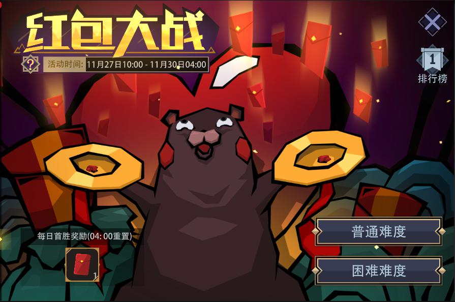 活动内容:天降红包啦!指挥玩偶去接取,看看你能得多少分。游戏分为普通、困难两种难度,无论哪种难度下进行游戏,只要每日首次胜利即可获得奖励;次日04:00刷新。挑战成功才有机会进入排行榜,按照难度和分数进行排名。