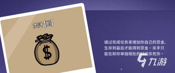肉汁的技能是可以依靠完成任务来增加自己的赏金,任务完成的数量越多,最终结算时拿到的银币奖励就会更加丰厚,需要注意这一奖励只有生存到最后才能获取,并且肉汁还有着杀手只能在我们单独相处的时候才能击杀我们的特性。