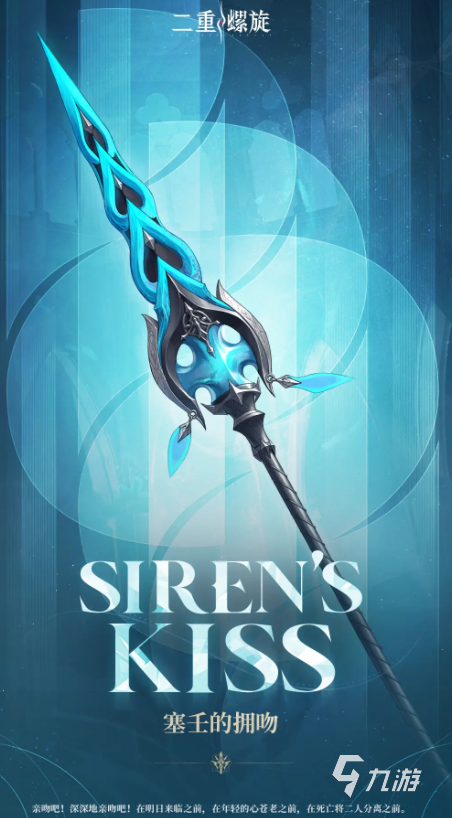 塞壬的拥吻看着有着水流一般的温柔外表,但却有强大的威力,它的武器技是让装备角色的技能范围上升,并且使用该武器进行普通攻击的时候,能获得1层攻速提升效果,持续15秒最多可叠加12层。
