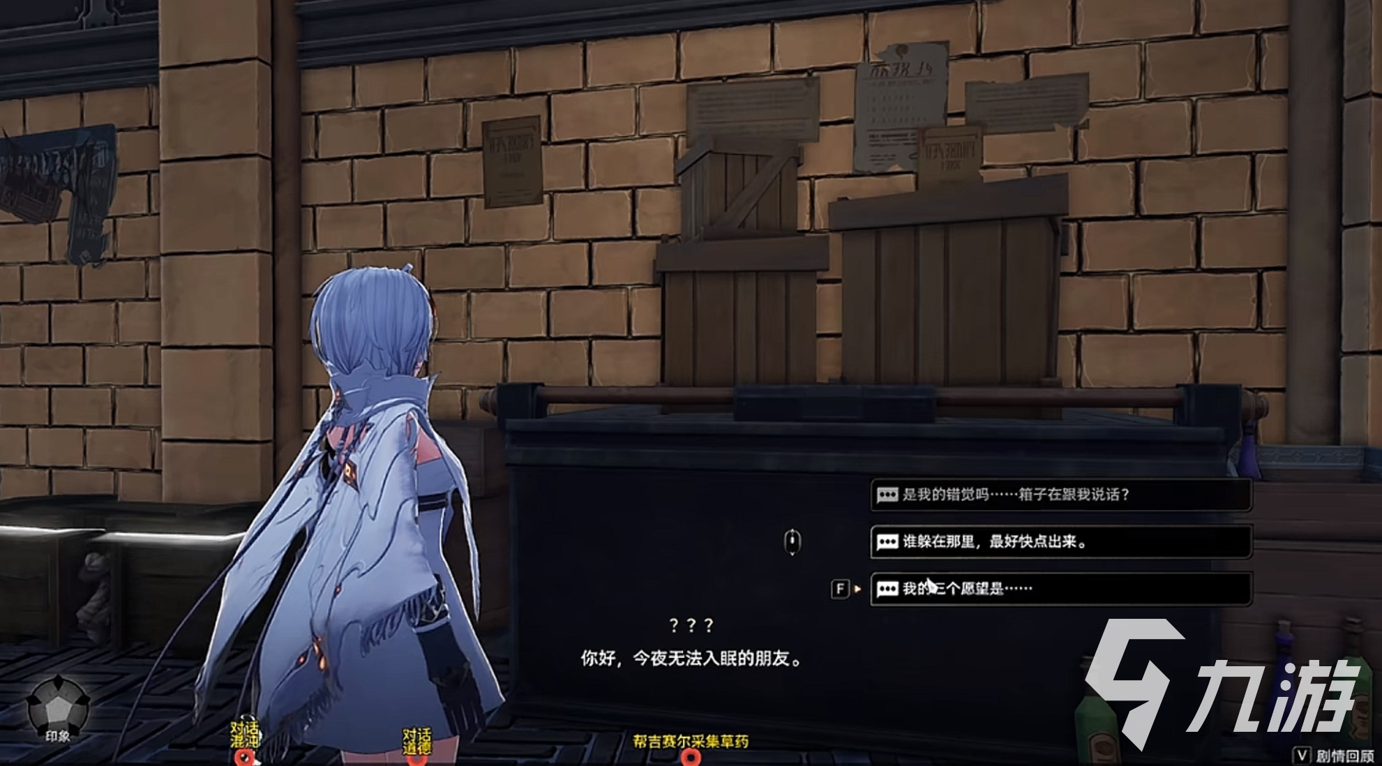 顺利跳下去后会自动进入剧情对话,出剧情后大家可以和面前的箱子发起对话,这时将出现【是我的错觉吗……】、【谁躲在那里……】以及【你的三个愿望是】三个选项,选择不同的选项会看到不同的对话,但推荐玩家们选择第三个,这样能更快完成任务。