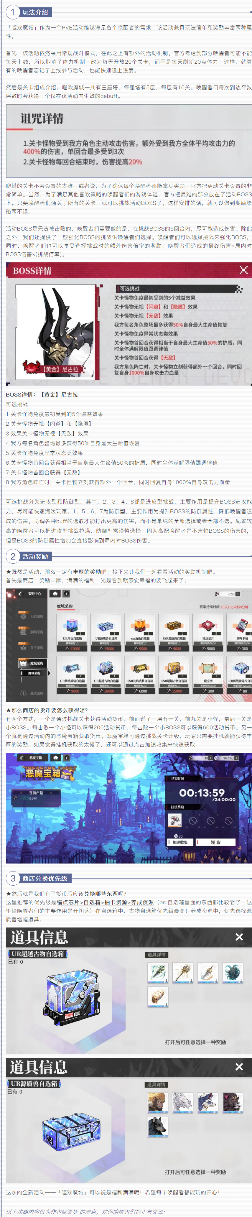 各位唤醒者大家好呀,今天凛冬居委会带来了由——<清梦>大大分享的「噬欢魔城」玩法攻略,本期攻略分为三个版块:玩法介绍/活动奖励/商店兑换优先级,这个才推出不久的全新活动到底怎么玩呢?现在跟着伊利里一起来看看吧~