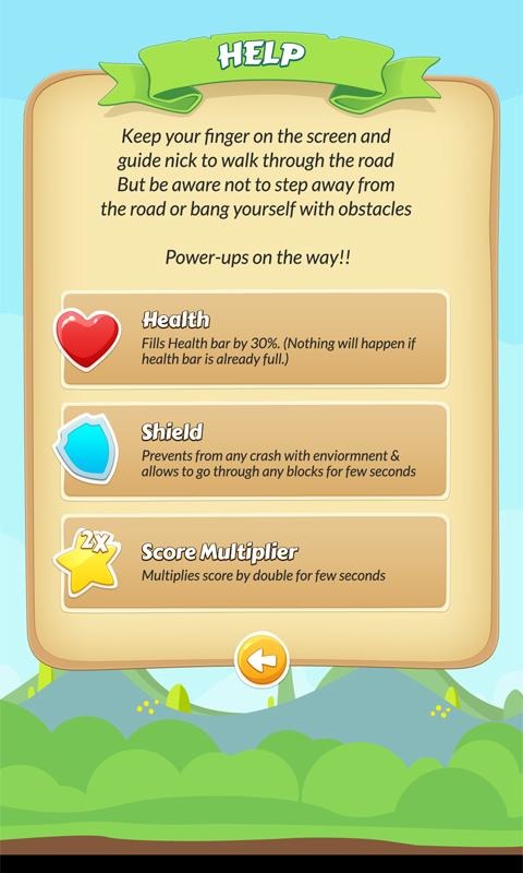 Keep your finger on the screen and guide Nick or Nickie to walk through the road. But be aware not to step away from the road or bang yourself with obstacles. Run as far as you can. Its easy to play! Share your score on facebook.