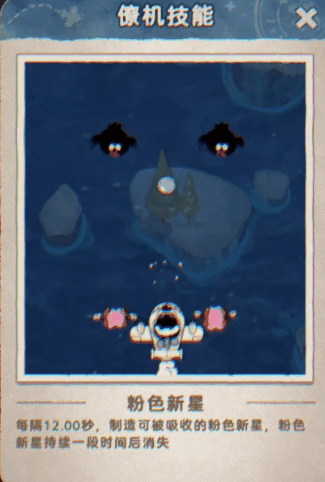 初始技能为每隔16秒,制造1颗可被吸收的粉色新星,粉色新星持续一段时间消失。攻击、生命、防御的基本属性加成为7.5%。 当粉色新星升至满星时,制造间隔缩短至12秒,每次制造数量提升至3颗,攻击、生命、防御的基本属性也提升为22.5%。