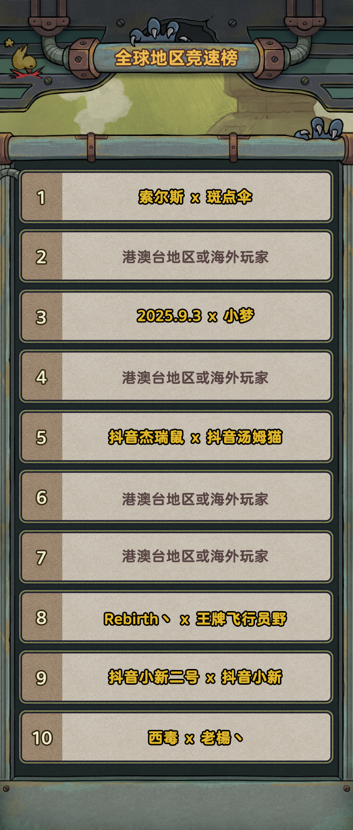除了双榜王,小发条还要为同样杀进双榜的另外5支顶尖小队点赞。他们凭借顶尖操作和神级默契,喜提包含【足金手指x2】在内的双榜奖励!大陆地区竞速榜2-8名也可获得【王牌招募卡*10】哦~