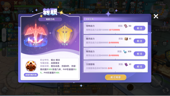 将所有任务完成后之后就能够点击前往转职完成任务之后最重要的就是选择转职的方向,小编这里以战士的转职为例来进行介绍,战士在转职后有两个方向分别是侧重输出和爆发的圣剑士,以及侧重肉盾和生存方向的守护者。之后技能和天赋也将发生变化,圣剑士能够获得专属技能,战意激发,激活之后在持续时间内提高破甲属性以及PVP和PVE伤害,而守护者的专属技能圣盾护佑,能够召唤出护盾保护自己,提高格挡值和防御属性。