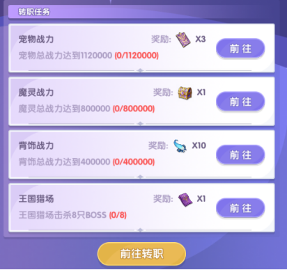 在目前三个初始职业达到一定要求后,都可以进行转职,转职需要完成转职所需任务,在任务栏中就能够看到方向与要求。