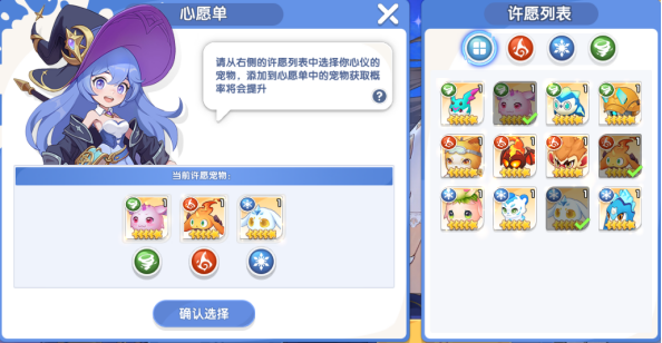 中期玩家还可以解锁心愿单,在心愿单中玩家可从SSR级宠物中任选一个风系、火系、冰系的宠物。后续玩家在占卜中要是抽取到了SSR宠物,那么其是玩家心愿单中宠物的概率就将大大提升。