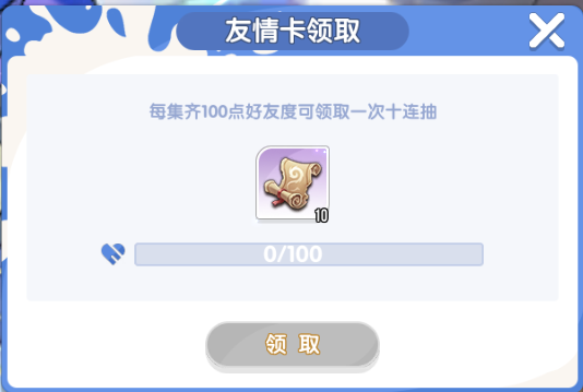 玩家每进行一次情谊点赠送,可获得1点情谊点,玩家集齐100好友度也可以获得一次十连占卜的机会。