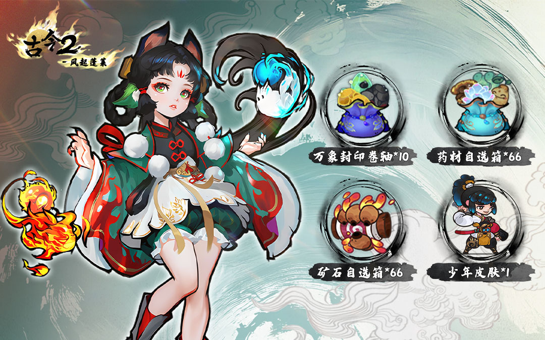 为感谢各位少侠的期待与守候,阿月准备了丰厚的江湖助力礼包。只要成功预约,首发后进入游戏,即可100%获得专属福利:万象封印卷轴*10,药材自选箱*66,矿石自选箱*66,少年皮肤*1。