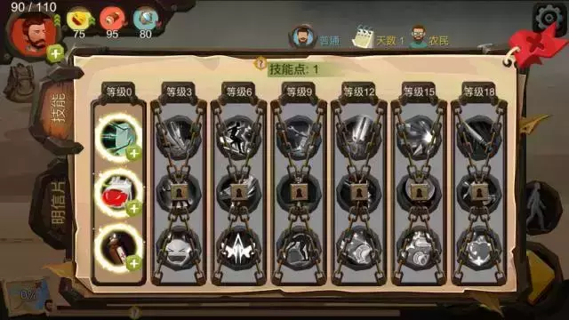 在生存数值之外,游戏中还有天赋数值和技能树可以开启。天赋点分别是力量、敏捷、智力和体质。技能树总共有21个技能可以选择,当人物升级到对应等级后便可以选择。