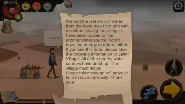 而除了真实的事件背景和设计,游戏中更多想表达的还是关于人性的思考与选择。游戏在父亲跨越千里找寻女儿的大故事背景之下,还在每个关卡设计了暗线。第一关教程阶段玩家得到的一个找水人的信便是第一关的故事线索:一个村庄断绝了水源,而出来寻找水源的人失败死亡,并希望有人能够带口信会村庄告诉大家水源已经断绝。