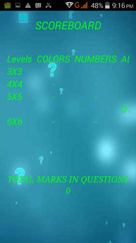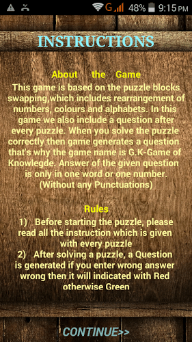 阅读说明第一或 之前看到播放视频 游戏简介 此游戏是基于积木块 交换,其包括重排 数字,颜色和字母。在这 比赛中我们还包括后一个问题 每一个谜题。当你解决了这个难题 正确,则游戏会产生一个问题 这就是为什么游戏名是G.K-游戏 知识。给定的问题的答案 仅在一个字或一个数字。Small Bugs And Sound Problems Are Fixed. Now You Can Also Share Your Scoreboard .