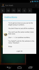 This addictive game will lead you through the world of maths. Don't waste your time doing nothing : USE YOUR BRAIN! Give a logic operation to find the target number. Use 6 numbers to hit the target. Got Math will set you arter. If it's not the case... watch the solution.