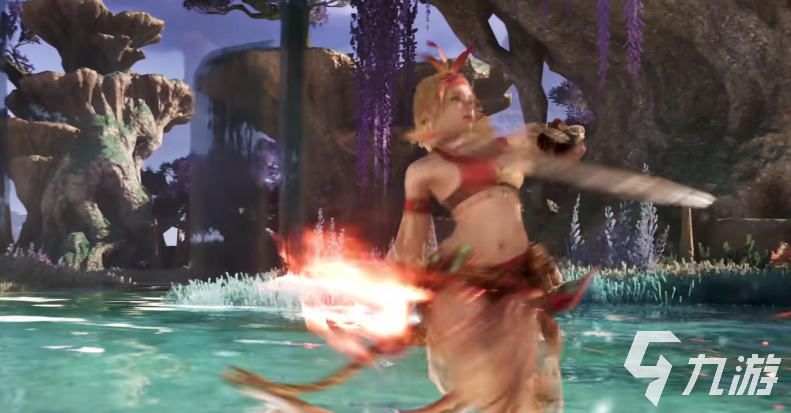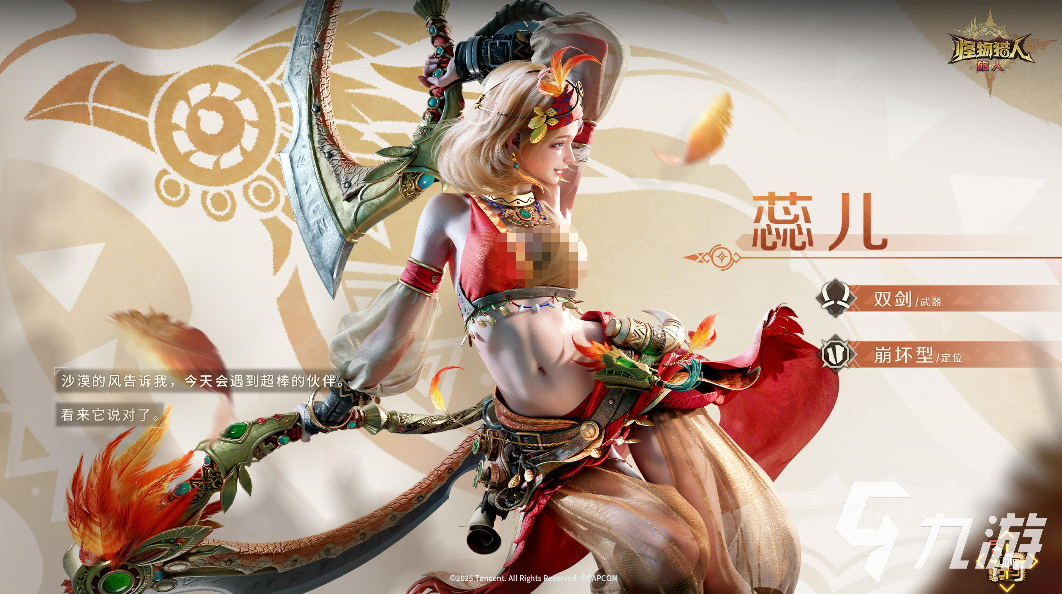 蕊儿的外形设计极具异域风情——浅金色的短发被风吹得微微扬起,发间点缀着明亮的红羽与金饰,仿佛将沙漠的热浪与阳光都化作了装饰。战斗时,蕊儿的衣摆与饰带随动作飞扬,配合手中那对锋利的弯刃,整个人宛如一阵炽热的风。