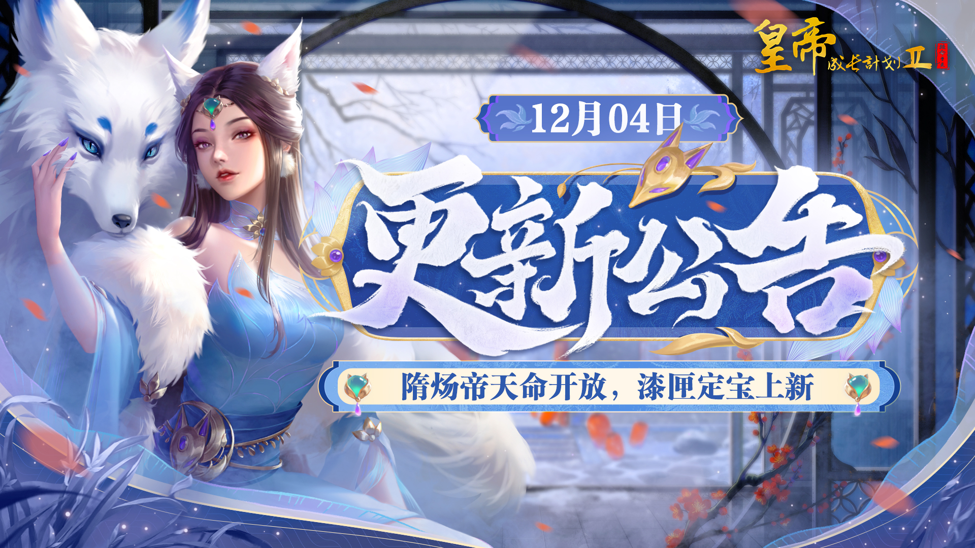 《皇帝成长计划2》于12月4日(周四)早上07:00-10:00(根据实际情况,可能存在一定提前或延迟)进行本周的版本更新(期间可正常登录游戏),如有变动一切以游戏内正式公告为准。
