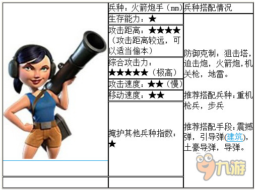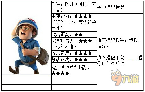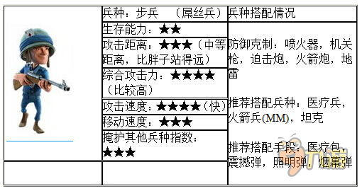 很基础的兵种,数量够多的时候还是很强大的,掩护性能排第二,害怕地雷和麻痹后剩余的群体伤害防御,所以进攻的节奏必须快。而医疗兵却可以很好的拟补这一缺点。