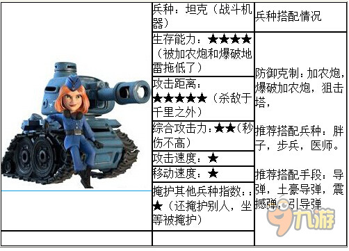 为新生代脆皮战斗机器。需要配合除了硬件(科技)上的支持,还必须带有高能量,高级导弹,实属土豪兵种。优点就是超远距离点杀。可以将别人松散火力逐个击破,缺点则是被克制防御太多,而且移动速度太慢。综合性能还算优秀,如果配合胖子,则可以打火箭等级比较低而狙击和加农比较高的防御,配合医疗则可以顶火箭和迫击炮。是土豪最喜爱的兵种之一。