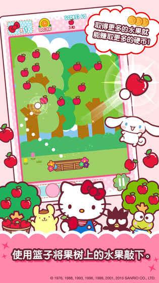 欢迎来到Hello Kitty的果园。 Hello Kitty和她的朋友们正打算重新整顿她们的果园,您也一起来帮忙装饰果园吧! 朋友们需要您帮忙采摘野果变卖。您可以用赚来的钱去买可爱的椅子,盘栽,以及各种各样的装饰品去装扮您的果园! 快来和My Melody, Bad Badtz-Maru一起玩吧!还有更多您熟悉的角色们在等着您! 游戏玩法: - 使用果篮去控制皮球,利用球把树上的果实打下来 - 完成一个接一个的关卡,解放新的农场,花园,和果园 - 购物家俬,解放新的农场,花园,和果园 - 赶走害虫,并在有限时间内取得良好成绩,赚取更多金币 游戏特色: - 容易上手但具挑战性。当心那些虎视眈眈的雀鸟和害虫吃掉您的果实 - 您可以升级并装备8位Hello Kitty角色,升级果篮和皮球让他们成为采集果实的最佳工具 - 将近有200个关卡供您挑战 - 30件独一无二,可爱至极的装饰品,让您把果园装扮成你心目中的样子 - 和Facebook上的朋友竞争,和朋友们分享您果园的图片 注意:即便该程式为免费下载,请留意,用户依个人意愿想提高他们的游戏经验而购买的礼包是需要以真实货币付费的。