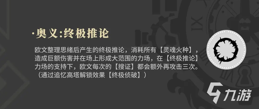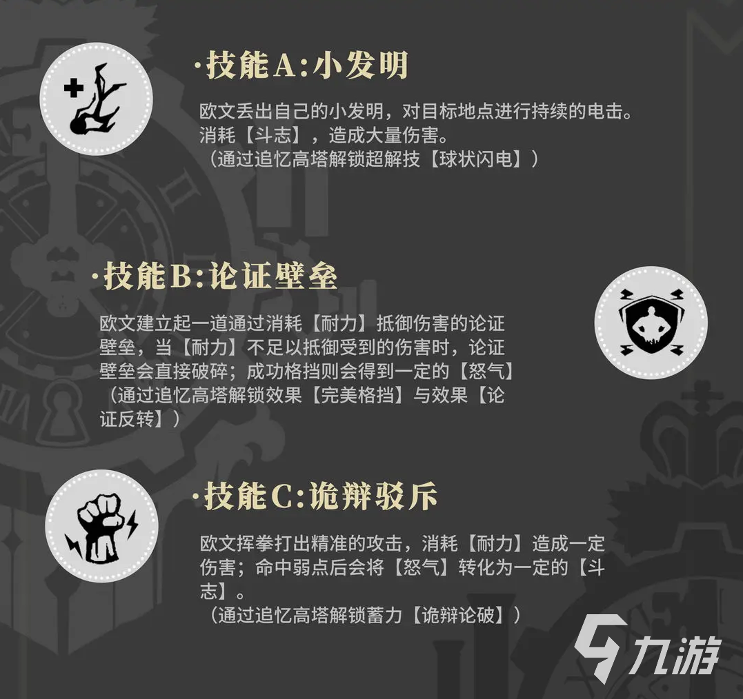 欧文的技能组拥有输出防御与精准打击能力,一技能小发明可向目标地点投掷装置进行持续电击,消耗斗志造成大量伤害,超解技球状闪电通过追忆高塔解锁。二技能论证壁垒是他的核心防御手段,通过消耗耐力来构筑屏障抵挡伤害,成功格挡可获得怒气,耐力不足时屏障会破碎,此技能同样可通过追忆高塔进阶,解锁完美格挡与论证反转效果。三技能诡辩驳斥则是一个风险较高的精准攻击,挥拳消耗耐力造成伤害,若命中敌人弱点,能将怒气转化为斗志,其进阶效果蓄力诡辩论破也需在追忆高塔中解锁。
