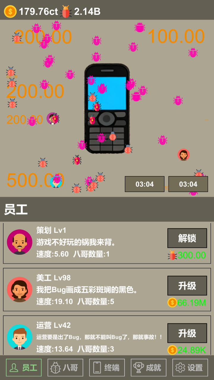 全员BUG是一款休闲放置游戏,点击屏幕中心的手机就会生产Bug,Bug碰撞到屏幕边缘就会获得金币和Bug数量增加,使用Bug可以解锁员工,升级员工,升级Bug。员工碰到手机就会生产Bug, 游戏公司的所有员工都来生产Bug了,没错,包括程序、策划、美术、运营、测试,还包括老板!!他们都在手机游戏里生产Bug,每个员工生产不同的Bug,每种Bug外观和价值大大不同。攒够足够的资源还可以升级手机,手机从远古时代的按键直板机,到现在流行的折叠屏。听起来是不是很有趣,来呀!一起写Bug呀!Tips:本游戏内含有使用 AI 生成的游戏资产