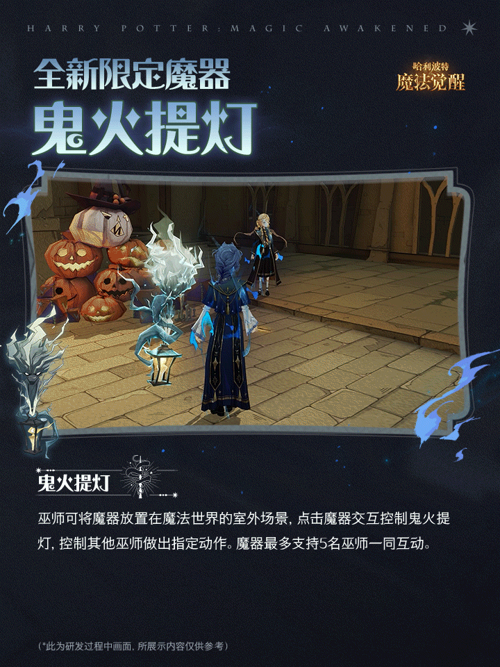-巫师可将魔器放置在魔法世界的室外场景,点击魔器交互控制鬼火提灯,控制其他巫师做出指定动作。魔器最多支持5名巫师一同互动。