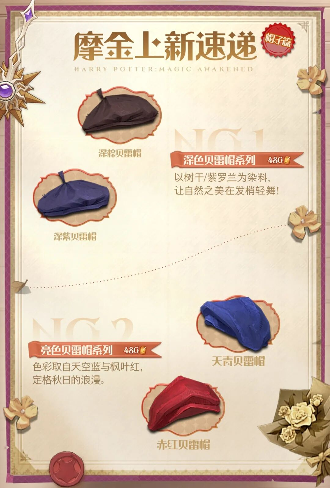 -全新帽子:帽子「深棕贝雷帽」、帽子「深紫贝雷帽」、帽子「天青贝雷帽」、帽子「赤红贝雷帽」。