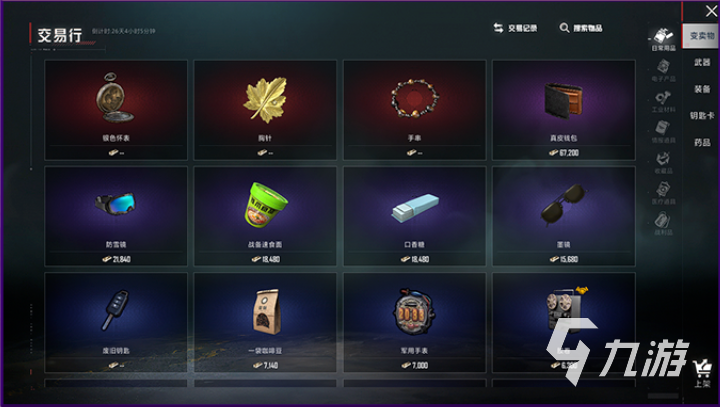 在地铁大厅的右下角就是交易行的入口,进入交易行后,可以浏览到目前在出售的地铁物资,一共有5个种类,变卖物,武器,装备,钥匙卡,药品;可根据自己需求按照物资分类去寻找,也可以直接在搜索框快速搜索;大家在交易行购买的变卖物会被绑定,不能再次上架交易;