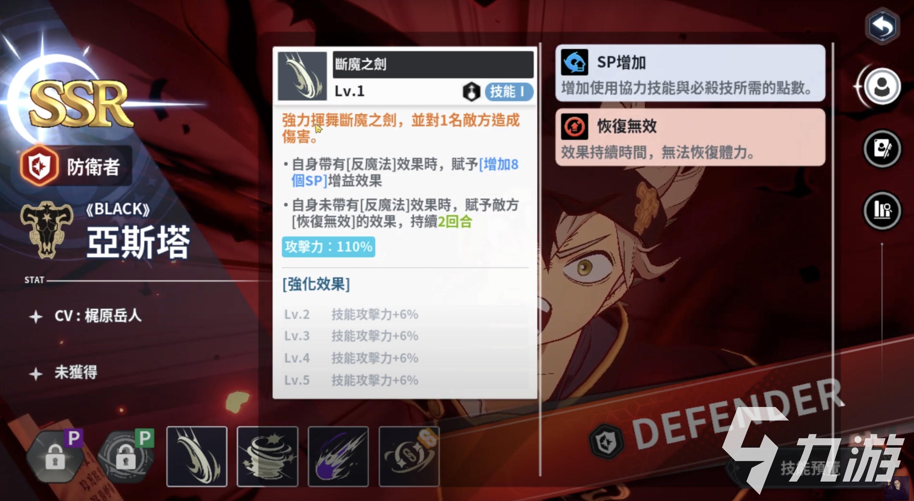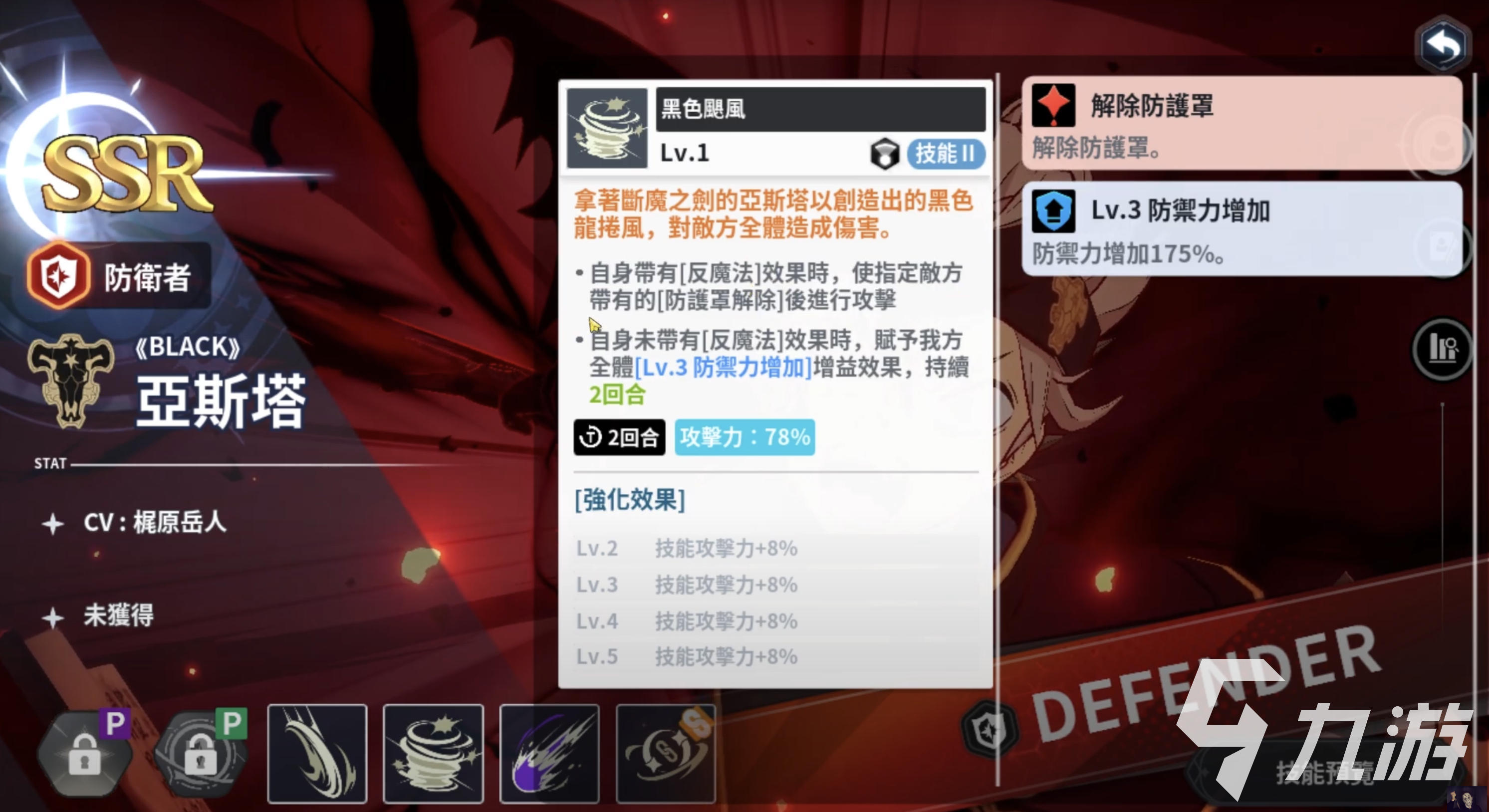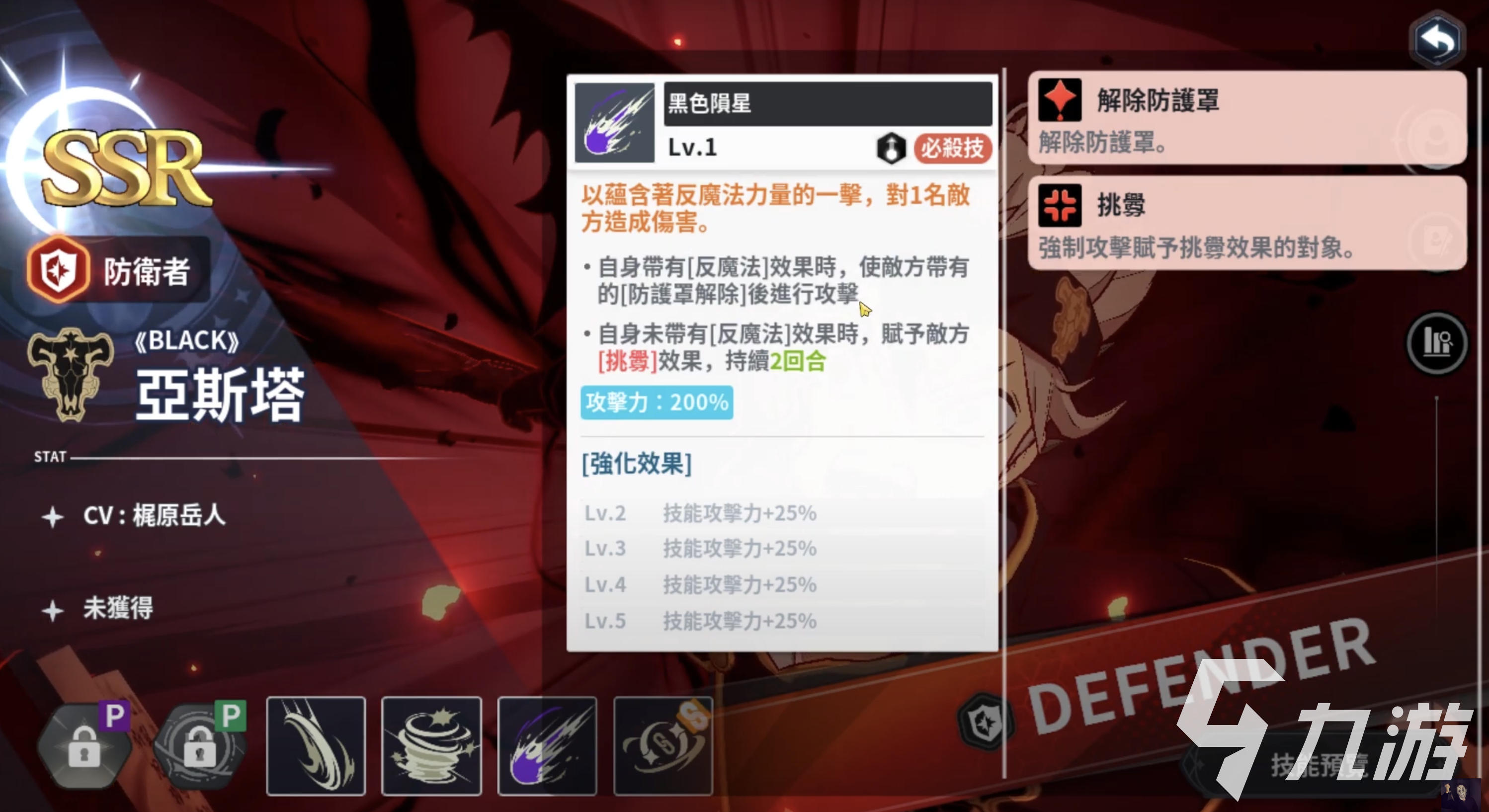 必杀技“黑色陨石”是亚斯塔的爆发手段,单体攻击力高达200%。在拥有[反魔法]时,能直接移除敌方护盾后进行斩击,破防与高额伤害兼具;而若没有[反魔法],则会对敌人施加2回合的[挑衅]效果,将火力集中到自己身上,为队友创造输出环境。这种“双形态”的设计让亚斯塔能在关键时刻承担起主T的职责。