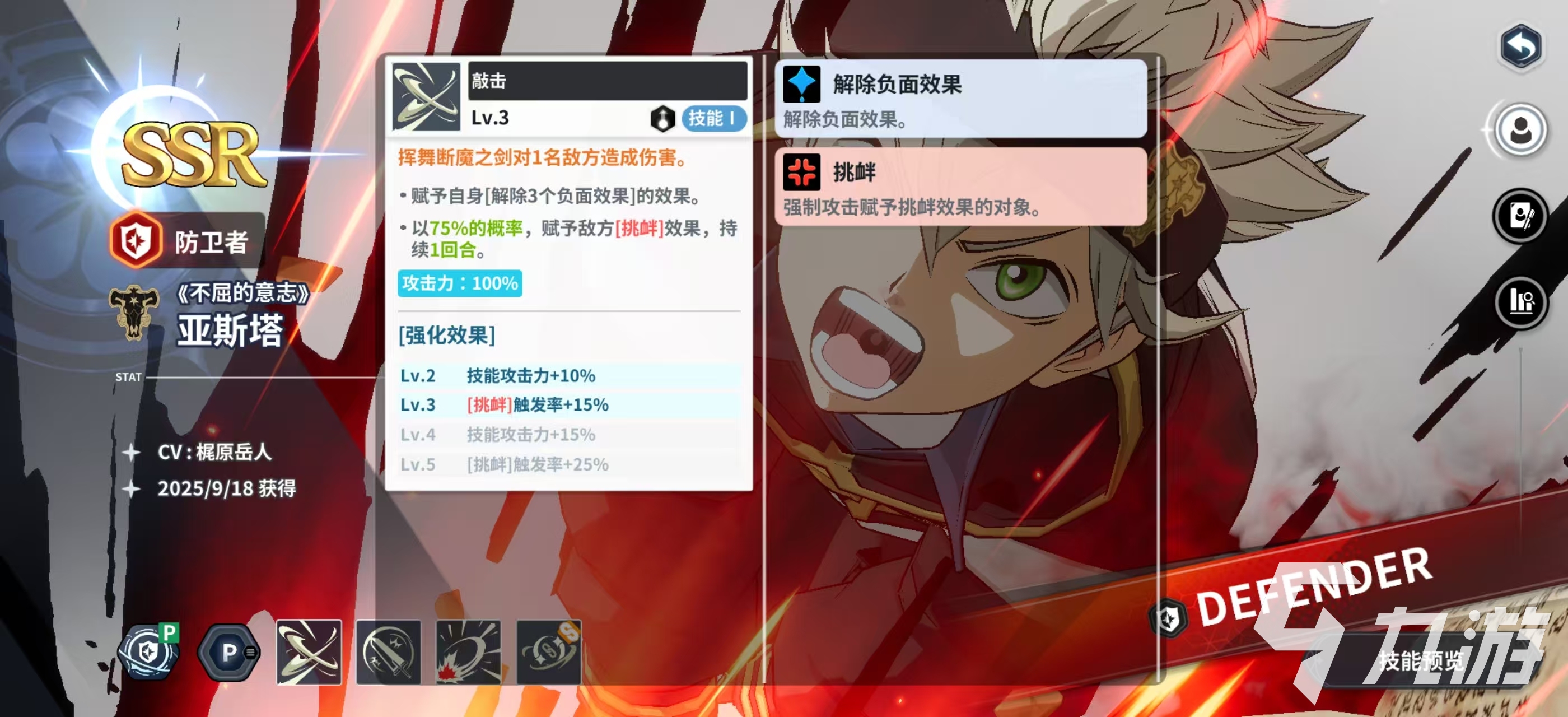 不屈的意志亚斯塔是SSR级别的角色,角色定位为防卫者,是能输出也能当坦克的角色,在游戏里面主修攻击防御和体力,有条件的增加一点暴击能提升该角色的输出上限,专属被动1可以在战斗开始的时候减少自身承受的20%的伤害,觉醒被动1在使用技能二的时候以50%的概率,赋予敌方解除敌方BUFF的效果,觉醒被动2以100%的概率,赋予解除敌方BUFF的效果,在对战的时候非常好用,可以解除敌人的强化,变相削弱敌人。