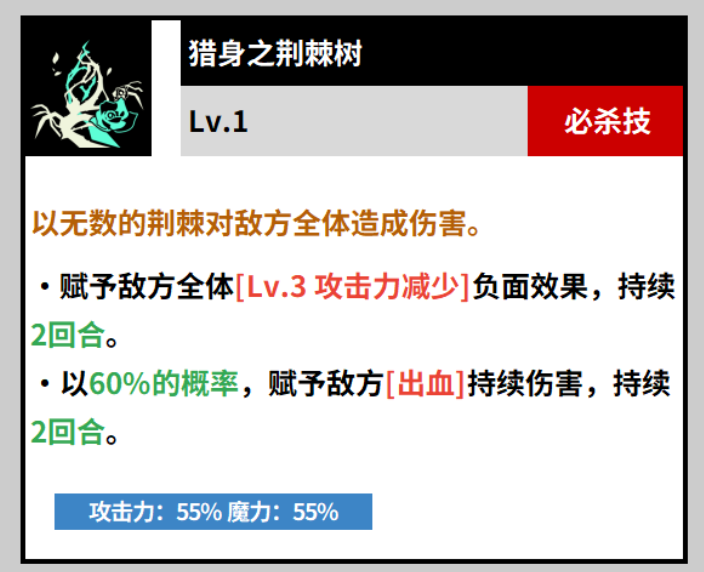 必杀技的效果是以超多的荆棘攻击敌方,对敌人单位全体造成伤害,赋予敌方全体3级攻击减少的buff,持续两回合,60%的概率,赋予敌方出血持续伤害,持续2回合,本身技能的伤害都不高,但是搭配被动的效果和队友的辅助,这个角色的坦度会有质的飞跃。