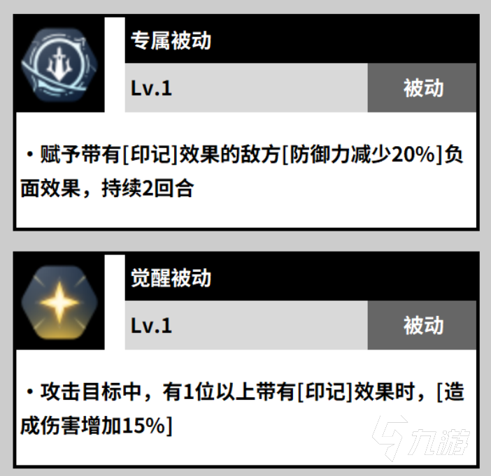 角色的专属被动1赋予带有印记效果的敌方防御减少20%的负面效果,只要有1个及以上敌人带有印记效果时,造成伤害增加15%,升级后增加10%的效果,能提升角色非常高的输出能力,并且还能自带坦度。
